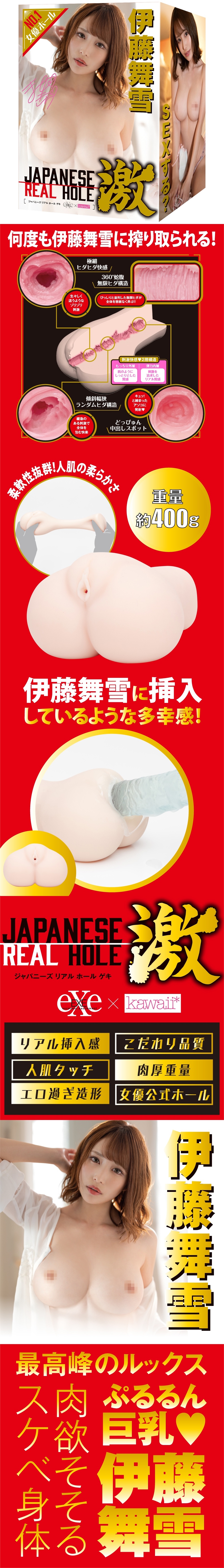 NO.1AV女優自慰套!!超刺激快感!『JAPANESEREALHOLE激』勾起肉慾的淫蕩身體_最美的顏值 盡情享受新一代No.1AV 女優伊藤舞雪刺激的極上名器!被伊藤舞雪榨乾榨盡吧!人體肌膚感「逼真的插入感・超色情的造型」確實感到插入感「肉厚重量」追求品質,和永遠只屬於您的伊藤舞雪享受真實又稠密的極上PLAY。內附潤滑油 審查編號:2305400