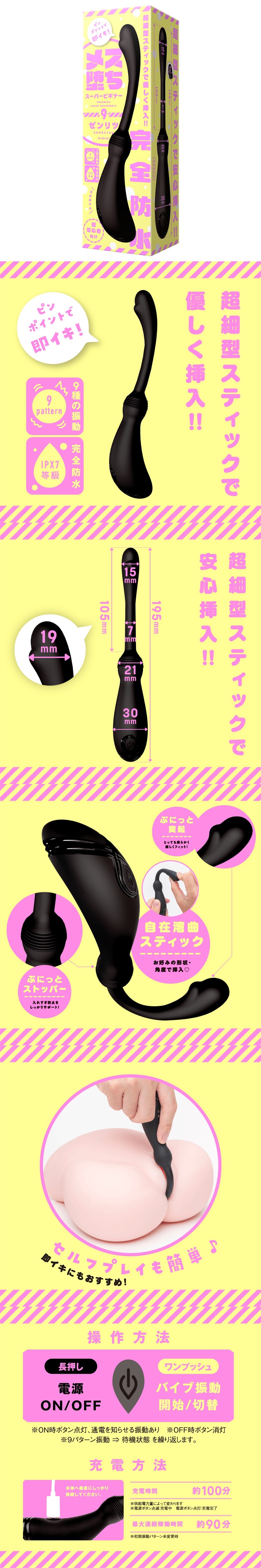 用超纖細型棒溫柔插入&精準定位達到即時高潮!!★PPP出品,推薦初學者使用的後庭自慰振動棒隆重登場!使用高品質的軟矽膠&咻~地易於插入的形狀的超纖細型棒,可以放心插入!!前端處的Q彈突起非常柔軟,輕輕貼合!可以自由彎曲的棒,可按照您喜歡的形狀和角度來插入♪Q彈的保險帶為防止過度插入提供了支持!自己享受簡單方便,超級老手瞬間高潮!★給人如女子一般的高潮,雌墮高潮規格的優秀振動棒!由於本體是充電式的,因此可以環保地使用。※本體:充電時間約100分鐘 ※本體:最長連續操作時間約90分鐘(初始振動模式不變時)_IPX7等級_9種振動模式_附屬品:USB磁吸式充電線 審查編號:2303487