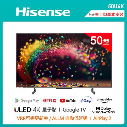【Hisense海信】50型QLED金屬量子點GoogleTV+Apple雙認證 4K HDR 全陣列背光連網液晶顯示器(50U6K)