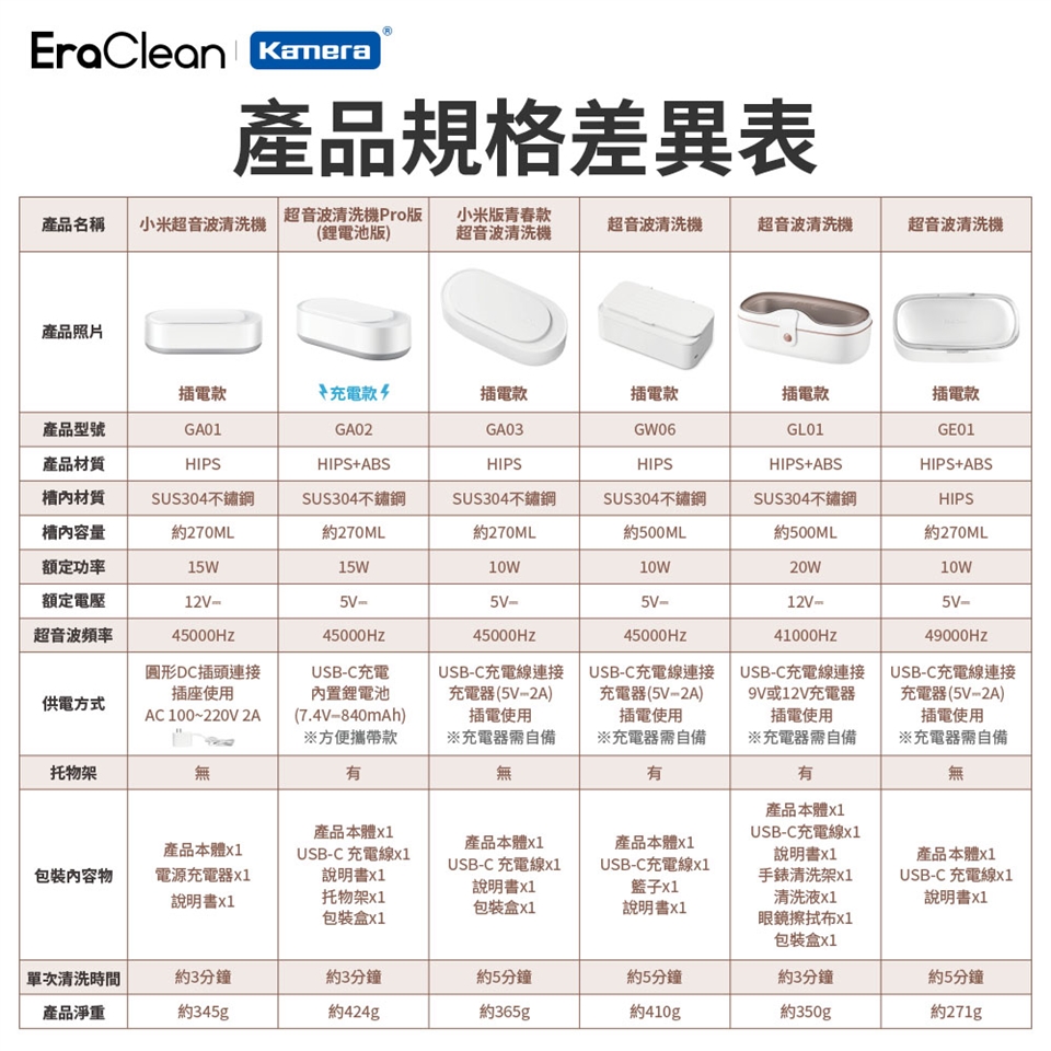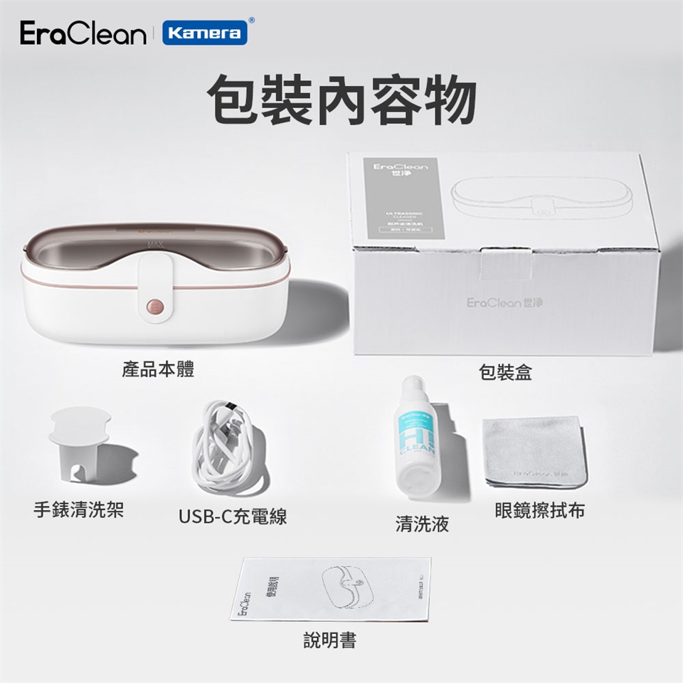 包裝內容:產品本體x1、USB-C充電線x1、說明書x1、手錶清洗架x1、清洗液x1、眼鏡擦拭布x1、包裝盒x1