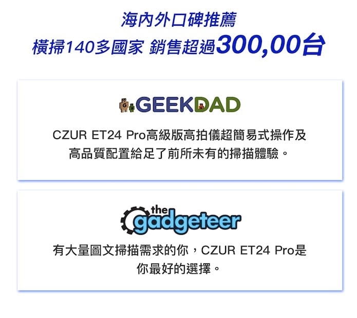 CZUR ET24 Pro 這次帶著業界頂級配置滿血回歸,王者光環般的 2400 萬工業級高清畫素,硬實力直接顛覆市面掃描儀及以往機型,擁有專業級掃描鏡頭,能瞬間清晰捕捉任何細節,精準展現清晰無瑕的畫面質感。同時,透過 320 DPI 及 24 專業色彩深度配置,不只還原、更是超越視覺上的色彩感動,給您巔峰造極的畫面衝擊體驗。放大、再拉近,拒絕一切含糊不清,這就是實力強大的自信!
