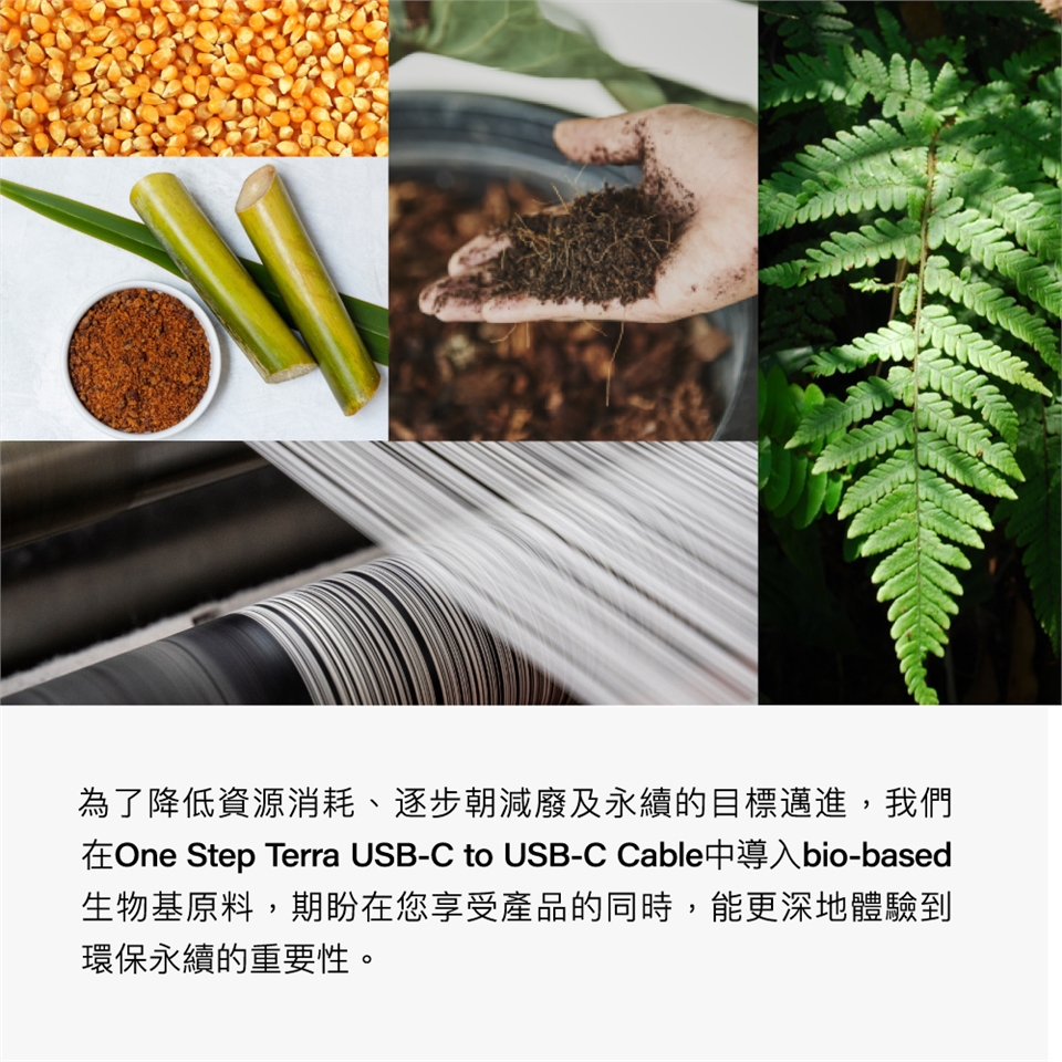 大多數塑膠產品使用油基材料,會向環境中排放有害氣體生產過程中的空氣,導致全球暖化和氣候變遷。 相較之下Terra線材採用18%生物基環保材料,而生物基材料則來自植物、農作物和樹木,其中含有碳水化合物。