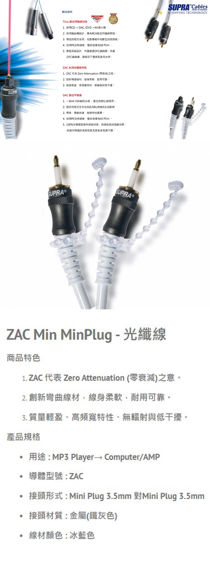 瑞典 supra 線材 ZAC Min MinPlug 光纖線/1M/冰藍色/公司貨