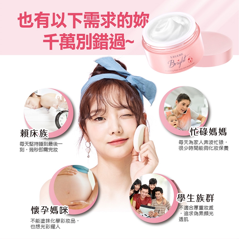 晚上–於化粧水後使用,取適量輕輕按摩於臉和頸部,待肌膚完全吸收透出層層淨白美感,可再視肌況擦拭其他保養品。