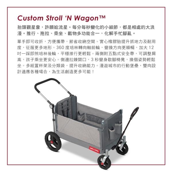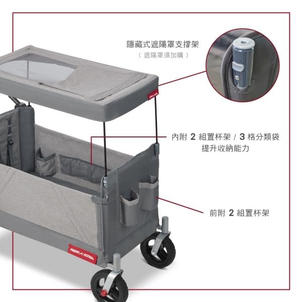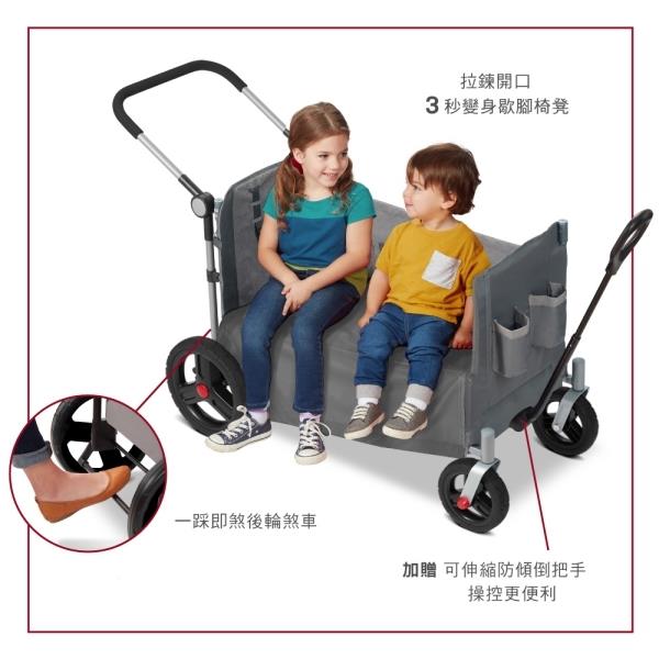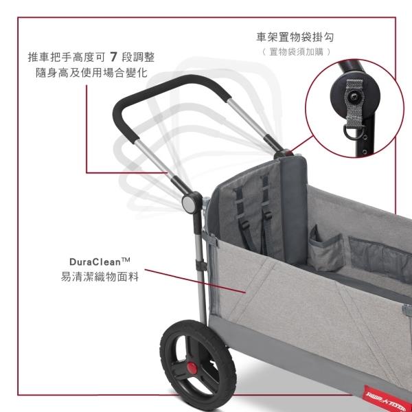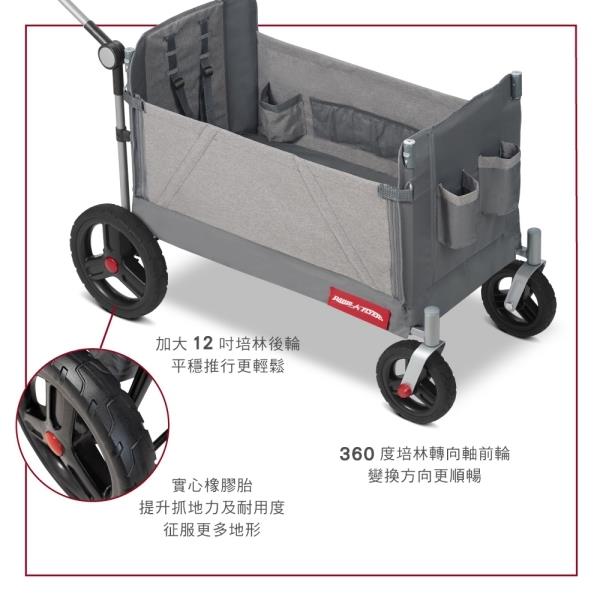 抬頭觀星象,許願給流星。每分每秒變化的小細節,都是相處的大浪漫。推行、拖拉、乘坐、載物多功能合一,化解手忙腳亂。單手即可收折,方便攜帶,節省收納空間。實心橡膠胎提升抓地力及耐用度,征服更多地形。360 度培林轉向軸前輪,變換方向更順暢,加大 12 吋一踩即煞培林後輪,平穩推行更輕鬆。兩側附五點式安全帶,可調整肩高,孩子乘坐更安心。側邊拉鍊開口 3 秒變身歇腳椅凳,換個姿勢輕鬆坐。多組置杯架及分類袋,提升收納能力。漫遊城市的行動堡壘,雙向設計適應各種場合,為生活創造更多可能!