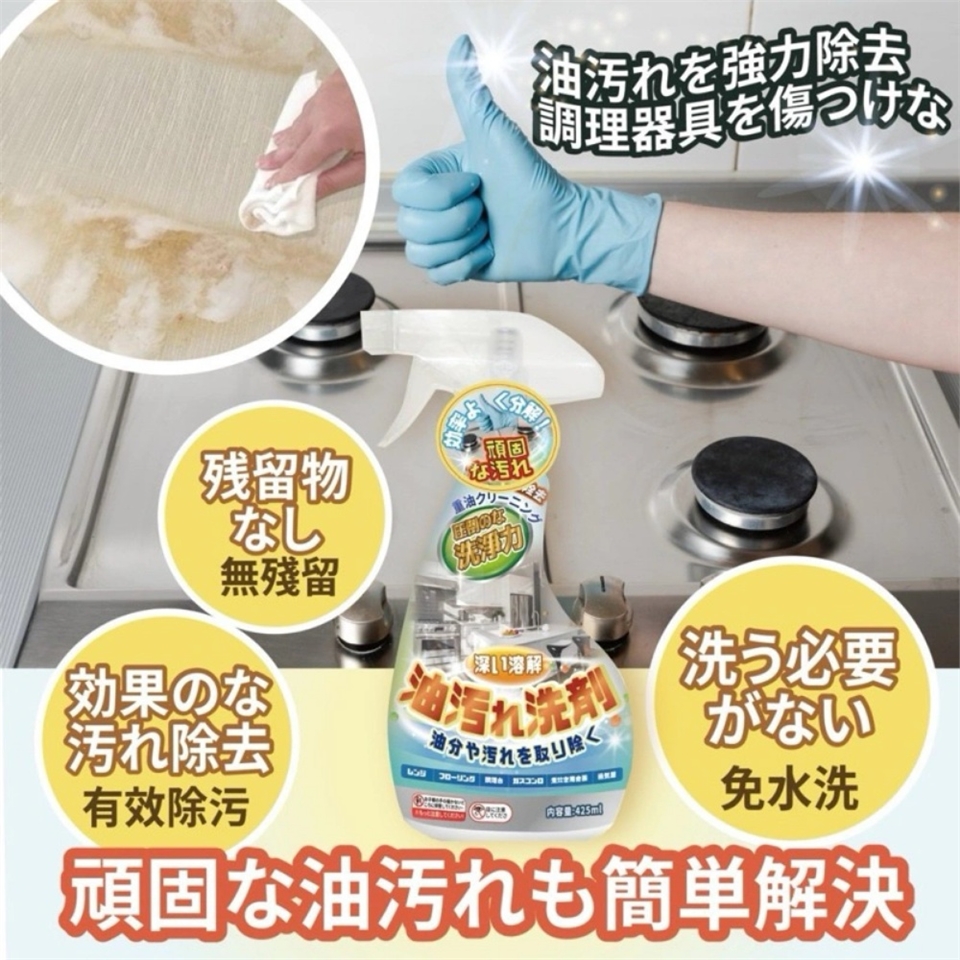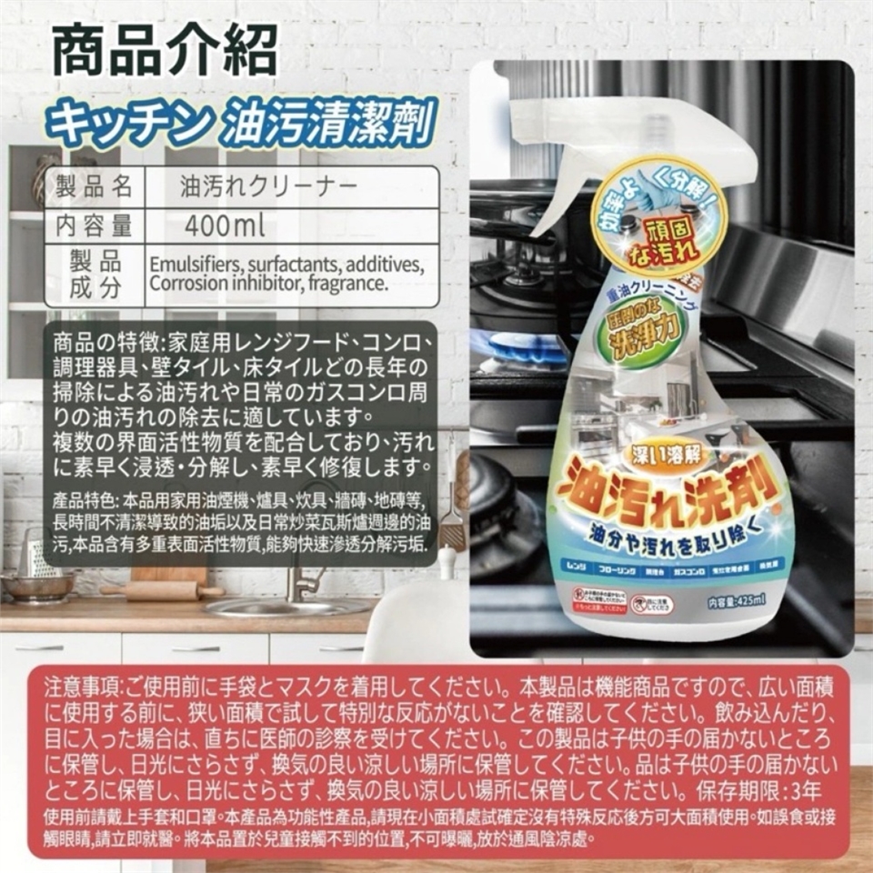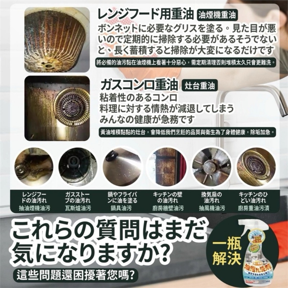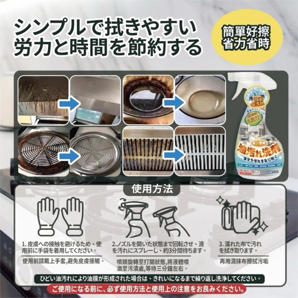 強效清潔 : 長時間不清潔導致的油垢和日常炒菜瓦斯爐周邊的油污都可以迅速解決。