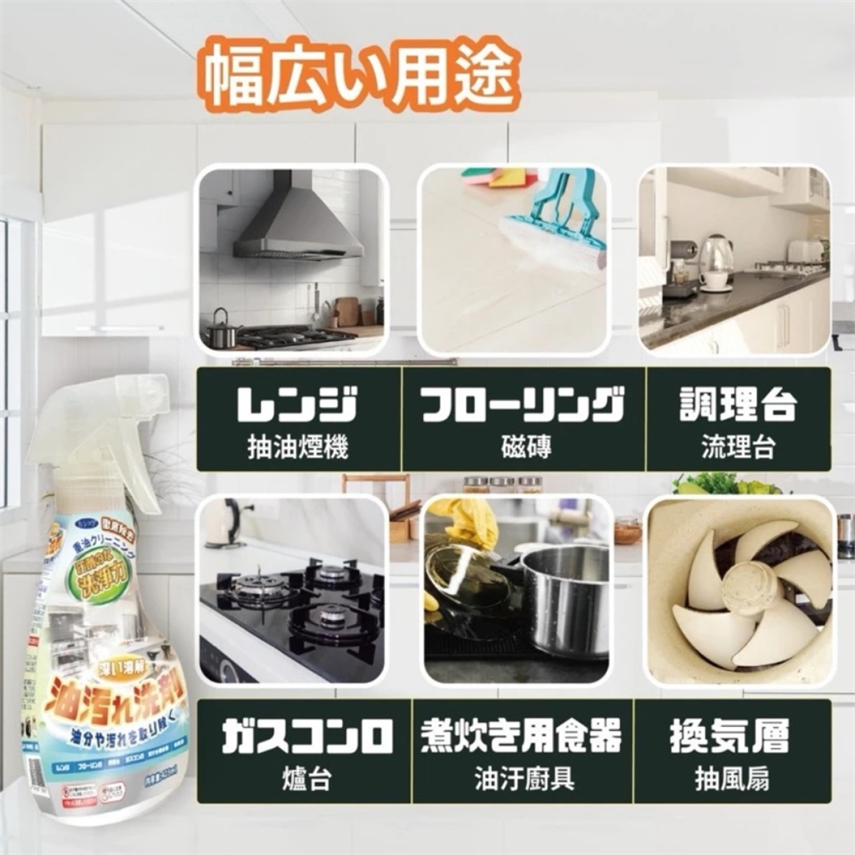 多功能應用 : 這款產品不僅適用於家用油煙機、爐具和炊具,還可以清潔牆磚、地磚等多種表面。