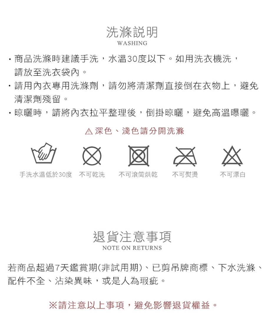 ◆內衣褲屬貼身物品,辦理退換貨時,除商品本身瑕疵外,一經剪標或下水恕不接受退換貨。