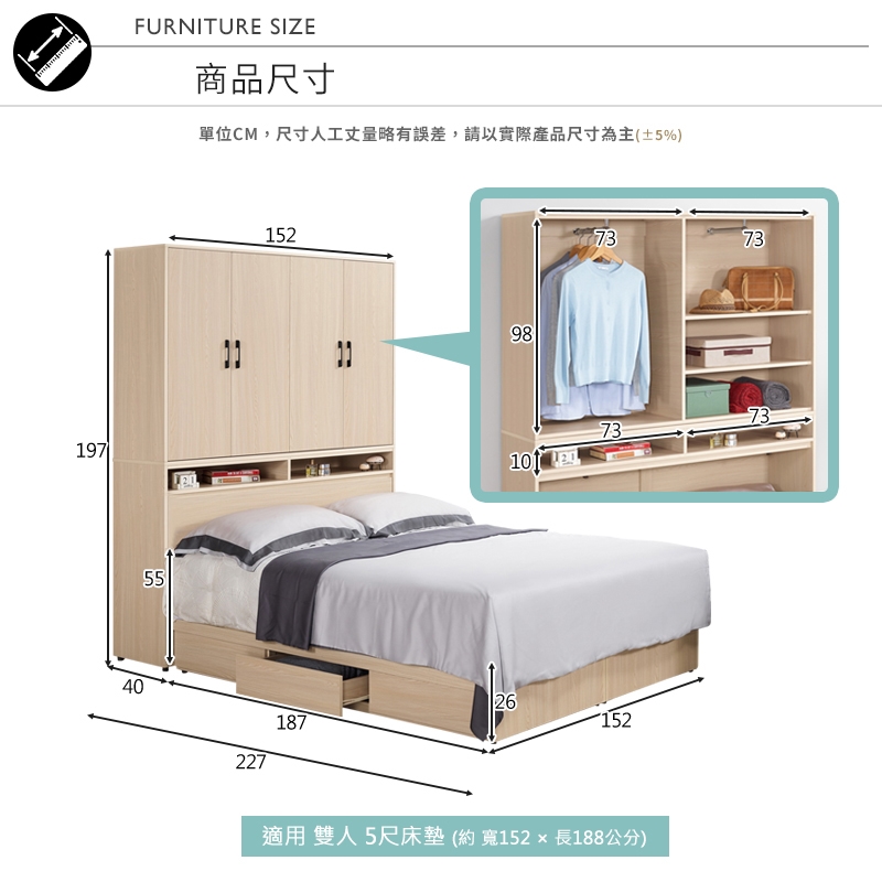 床頭上方採開放式收納,可擺放常用床邊小物,便利又實用!