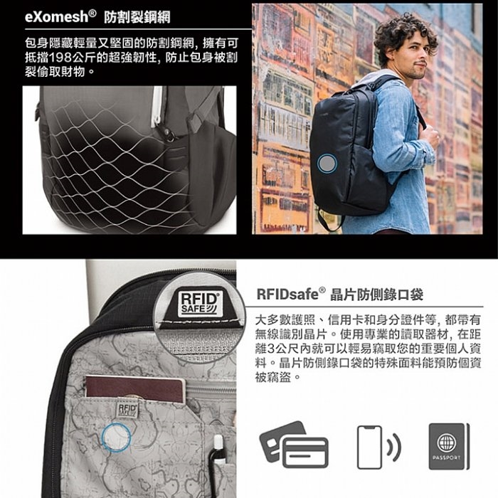 + 抗割裂保護網層(eXomesh Slashguards)袋內鋼網可抵禦小刀割損,財物更安全