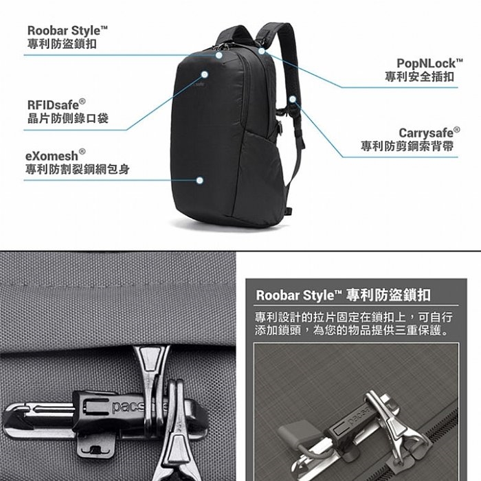 來自澳洲的Pacsafe防盜商品,搭載獲獎無數專利的防盜核心技術系統,結合高強度科技材質與特殊防割裂、防搶奪設計,讓隨身背包,旅行袋,護照腰包與安全配件,具備輕量化、超高耐用與隱形防竊的驚人特性!出國渡假前,你還為了確保行李安全煩惱嗎? 行銷全球的Pacsafe,保證讓您無後顧之憂,輕鬆樂遊行!是提升您出國旅遊安全的最佳選擇!