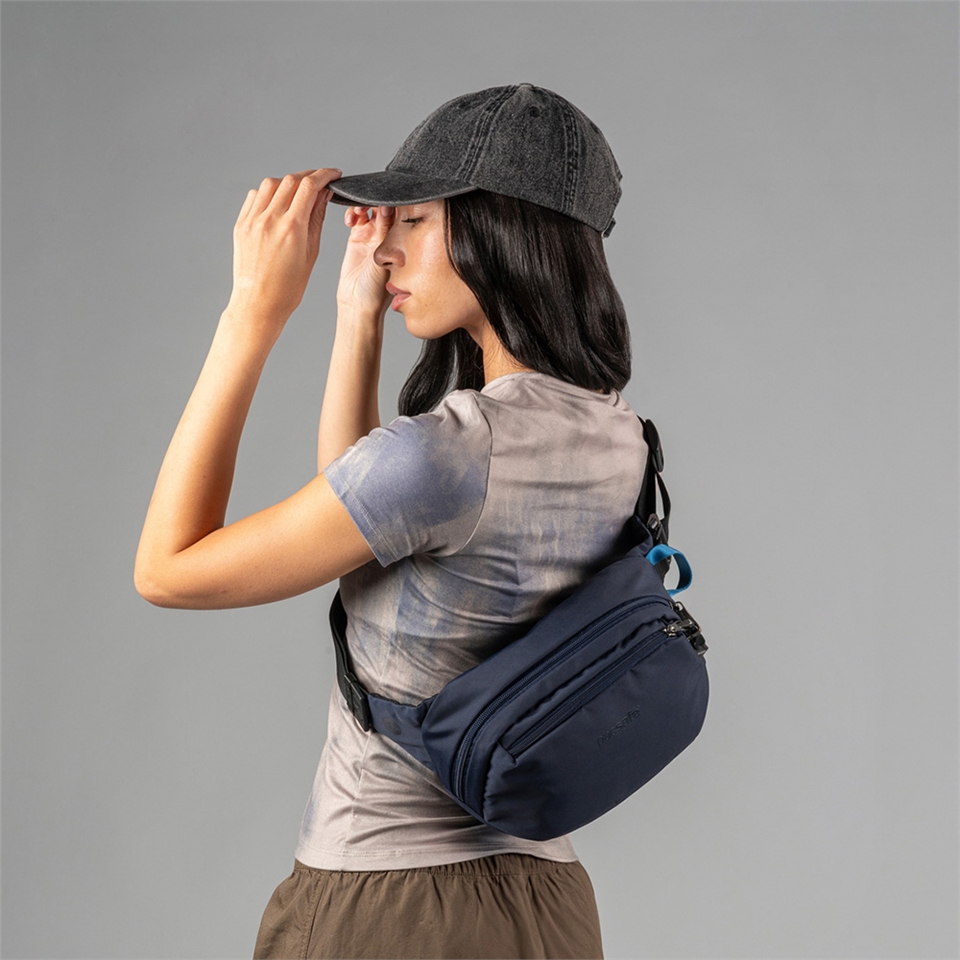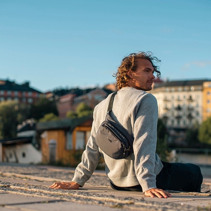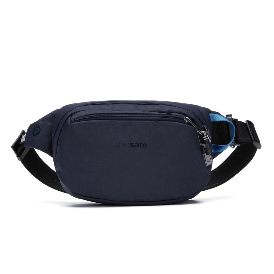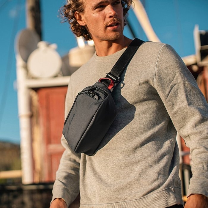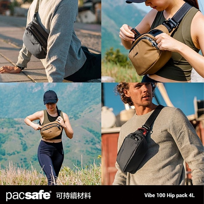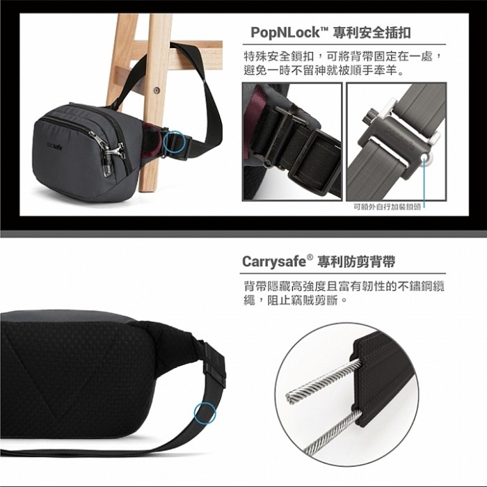 + 新設計的安全扣(PopNLock security clip)在腰帶/肩帶上,能作為纏繞在固定物而防盜,並可加上鎖頭
