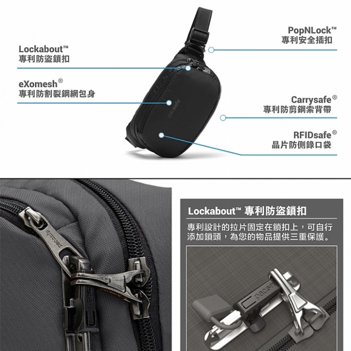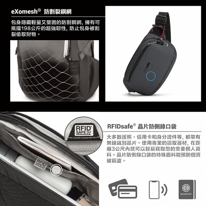 + 抗割裂保護網層(eXomesh Slashguards)袋內鋼網可抵禦小刀割損,財物更安全