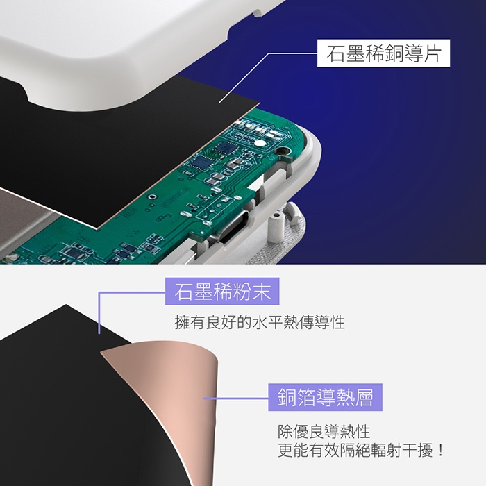 ◎ 以石墨稀銅導片強化散熱,確保充電過程中保持穩定,不卡頓,均勻散熱。