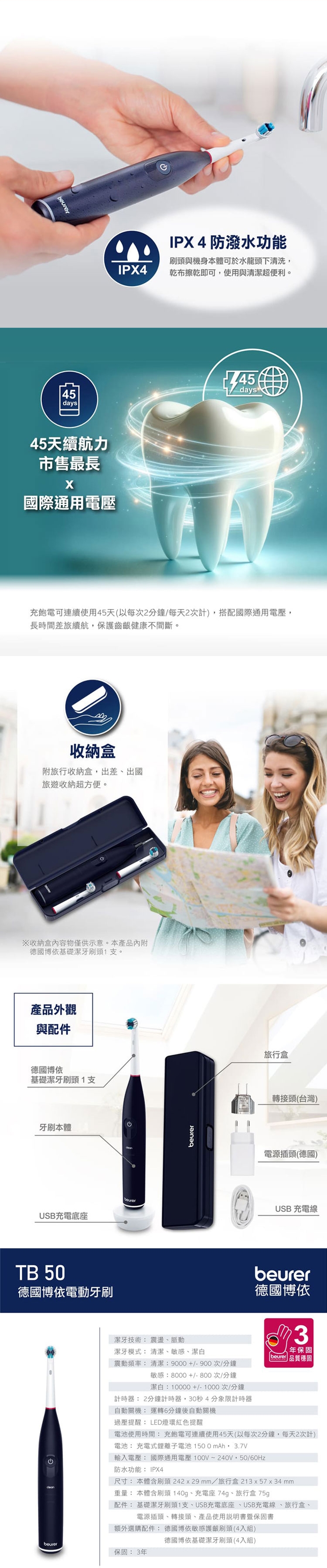 配件:基礎潔牙刷頭*1、USB充電底座*1 、USB充電線*1 、旅行盒*1、電源插頭*1、轉接頭*1(僅供台灣地區使用)、產品使用說明書暨保固書*1