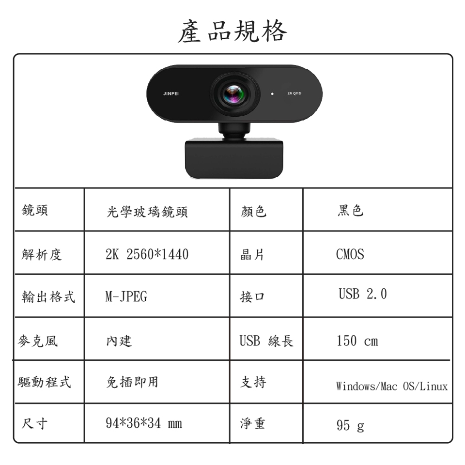[Jinpei 錦沛] 2K QHD 2560x1440 高畫質網路攝影機 視訊鏡頭 視訊攝影機 JW-01B-2K