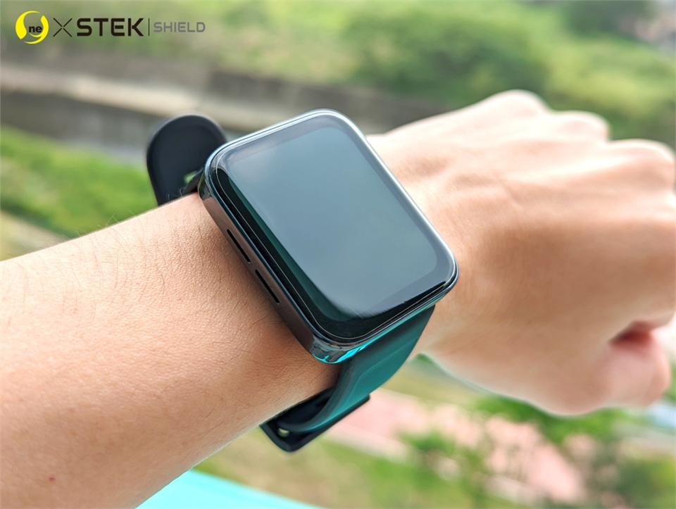 先以酒精棉片清潔螢幕,再用擦拭布擦乾,最後用除塵貼黏起灰塵;待孔位正確,黏合固定住,用刮板將膜撫平,小心撕除最上層表面離型膜,並撫平四周貼合