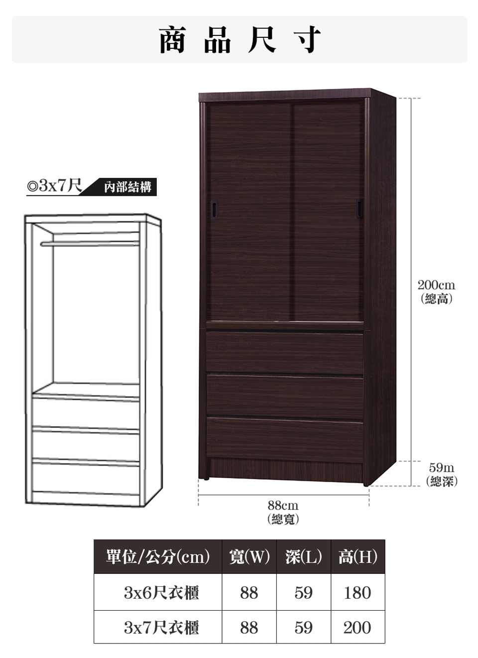 ※此賣場僅販售 簡約3x7尺推門三抽衣櫃/衣櫥(附側拉鏡)※