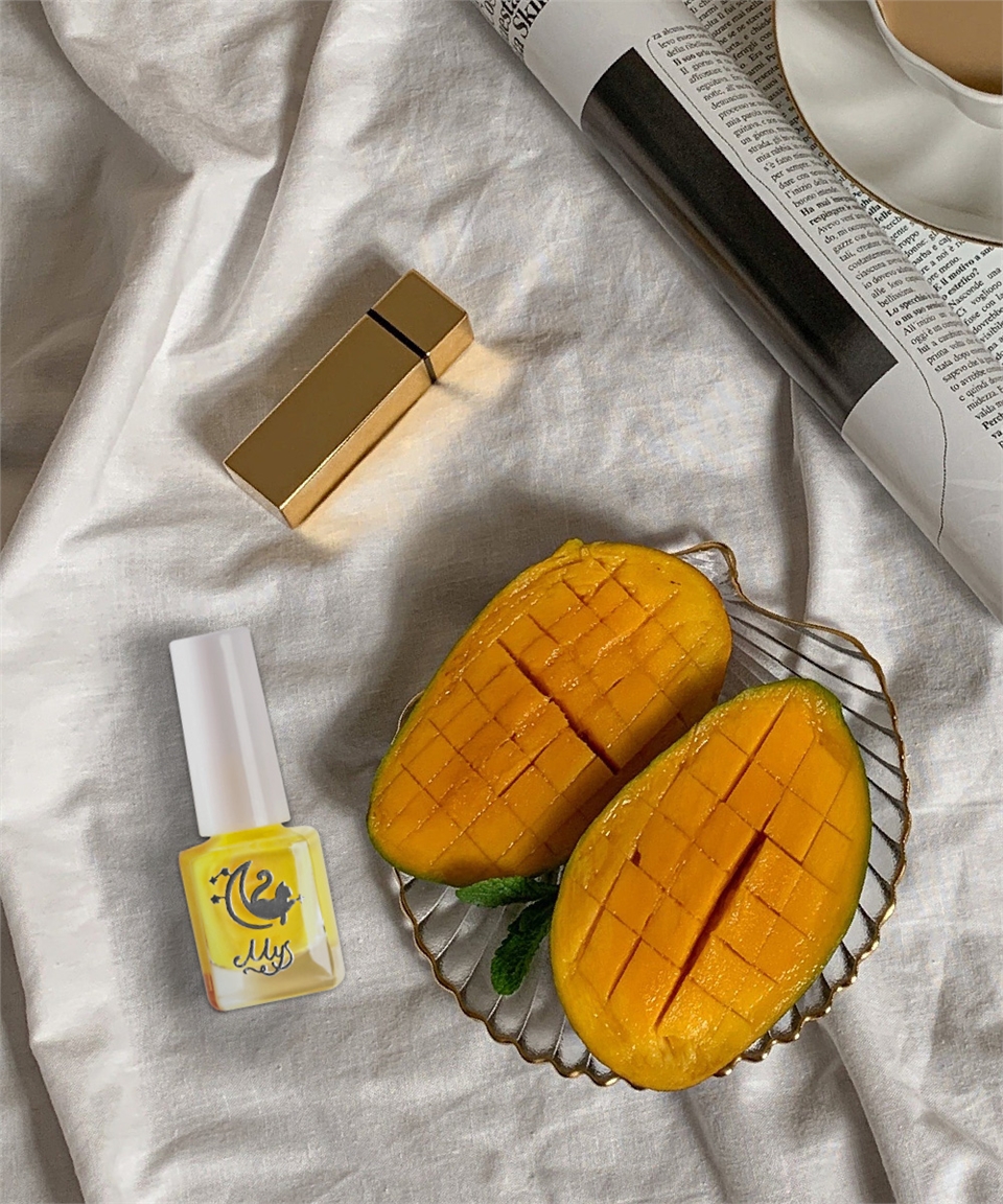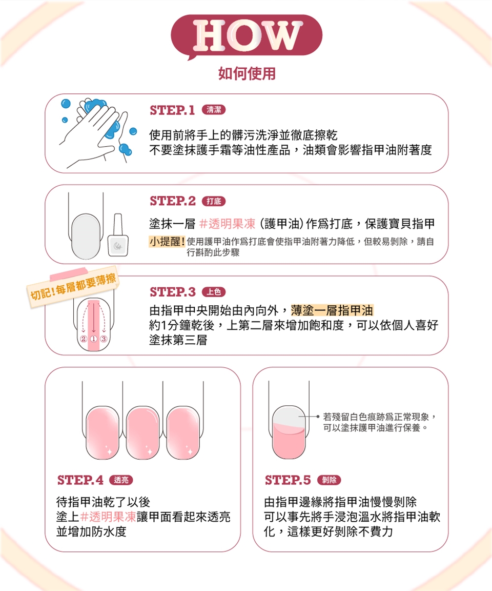不要塗抹護手霜等油性產品,油類會影響指甲油附著度,並塗上#透明果凍讓甲面看起來透亮並增加防水度
