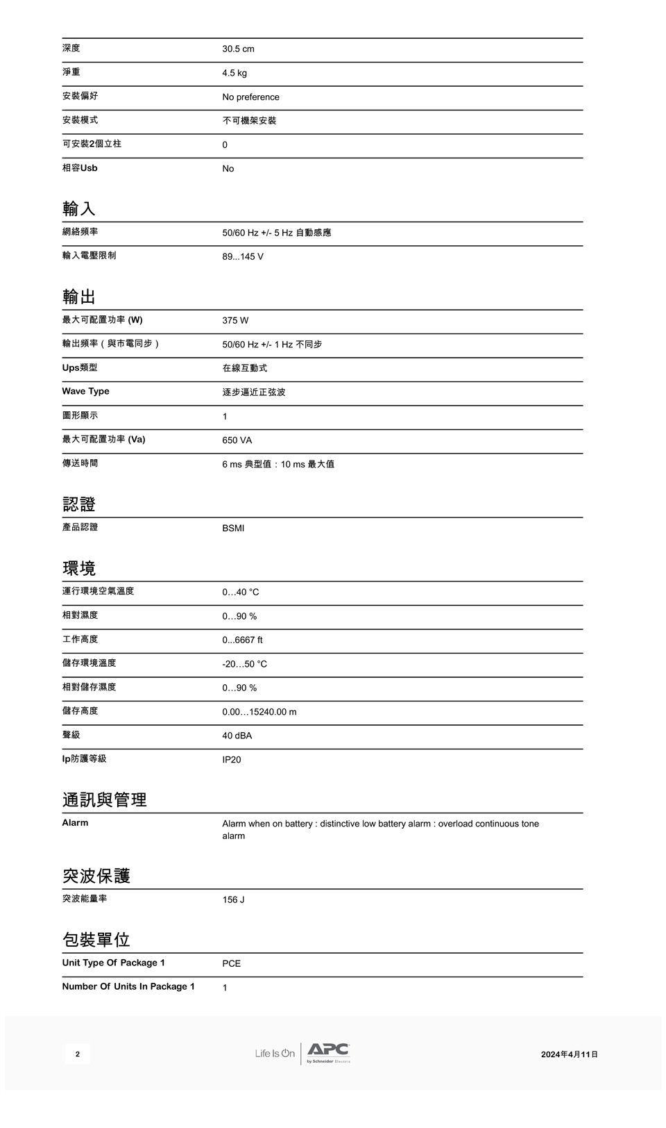 此款APC的Easy UPS (不斷電系統)可於家庭和小型辦公室的不穩定電力條件下提供電力保護,能在最關鍵的時刻確保一致且可靠的連線能力。 650VA地板/壁掛式UPS共有6個插座,所有這些插座均提供備用電池和突波保護。 它的突波能量額定值為156焦耳。 它具有自動電壓調節功能,可以將電壓的下降和浮動調整到正確的水平。 此UPS有3年保固期。
