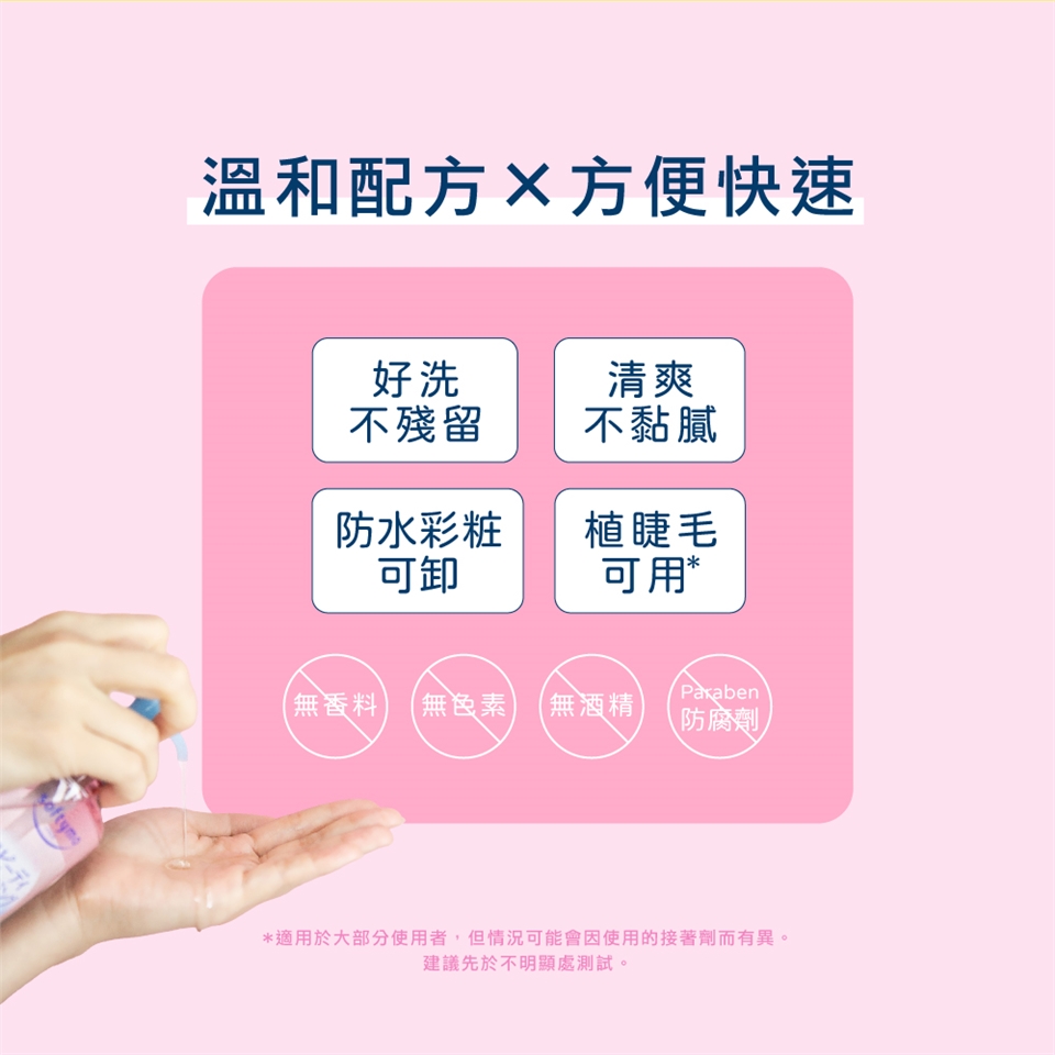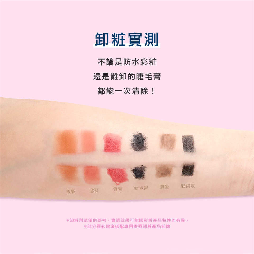 能輕鬆卸除彩妝、不會致痘致粉刺、手濕臉濕也能使用、任何膚質都適用