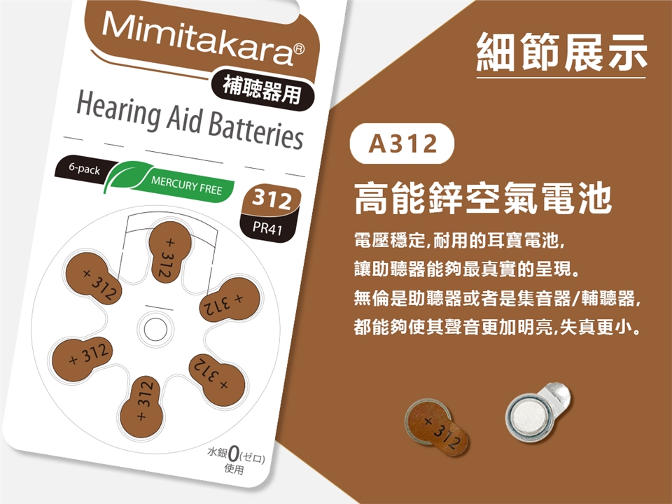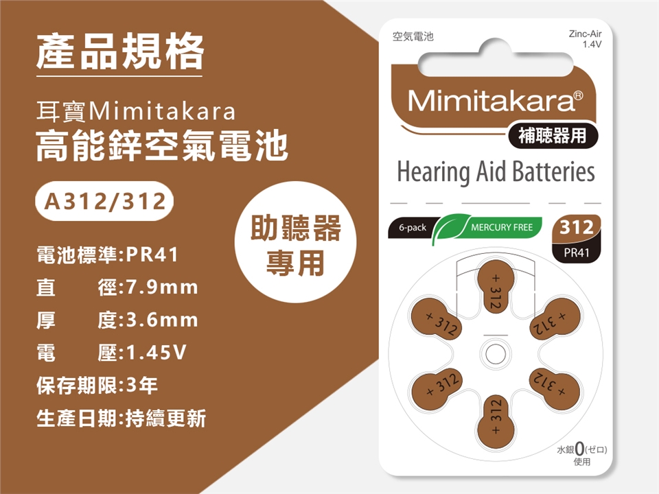 ● Mimitakara日本耳寶★日本助聽器電池 A312/312/PR41 鋅空氣電池 1排6入