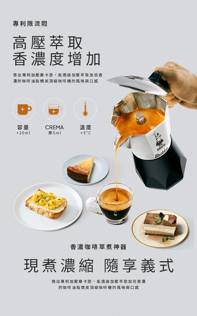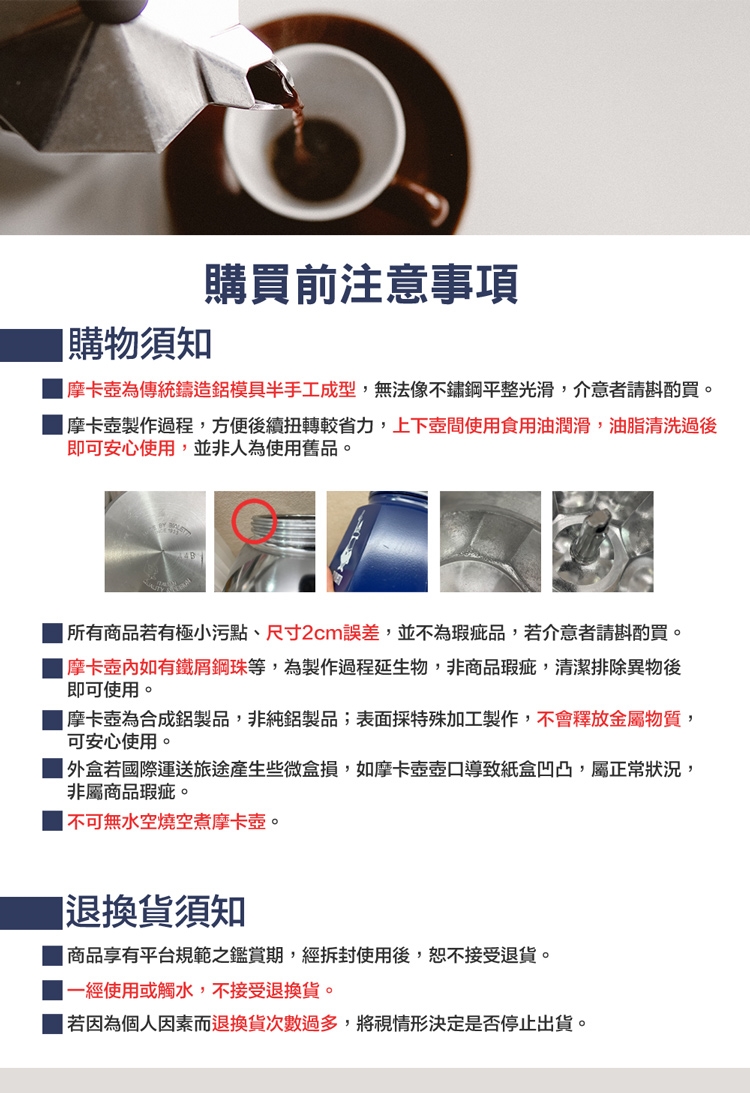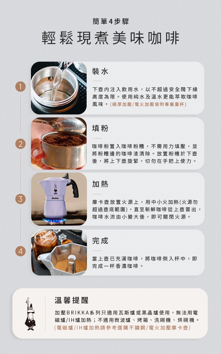 ※經典款MOKA EXPRESS系列/加壓款BRIKKA系列只適用瓦斯爐或黑晶爐的使用,無法用電磁爐/IH爐加熱;不適用於微波爐、烤箱、洗碗機 。