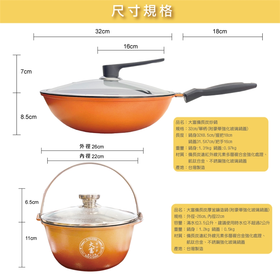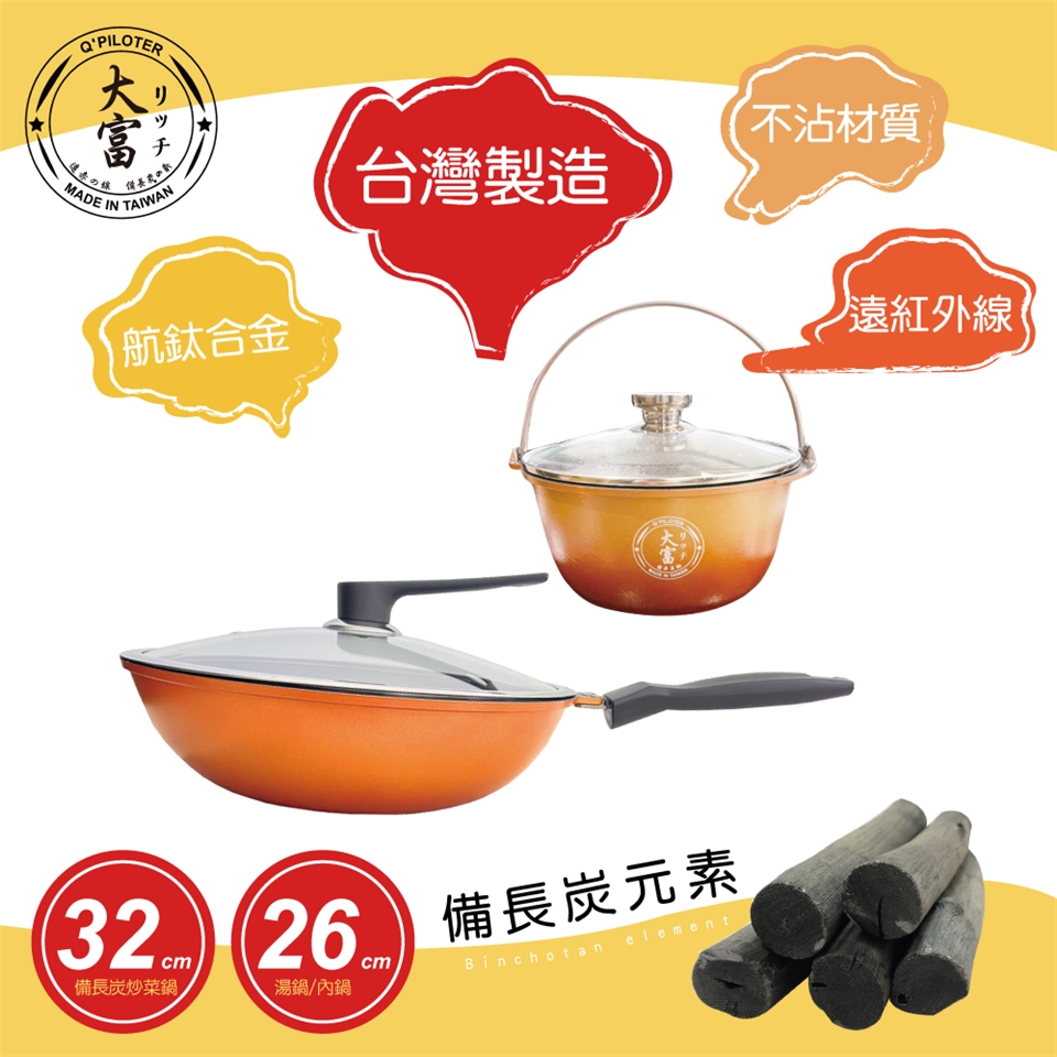 本產品組合:台灣製造 大富鍋 遠紅外線 備長炭 6層專利炒菜鍋彩金豪華款(32cm深炒鍋+22cm厚釜鍋) 送矽膠鍋鏟1支
