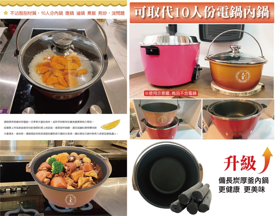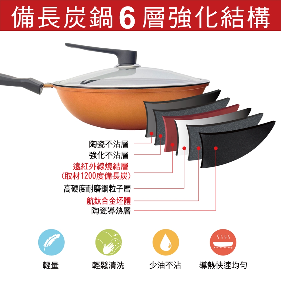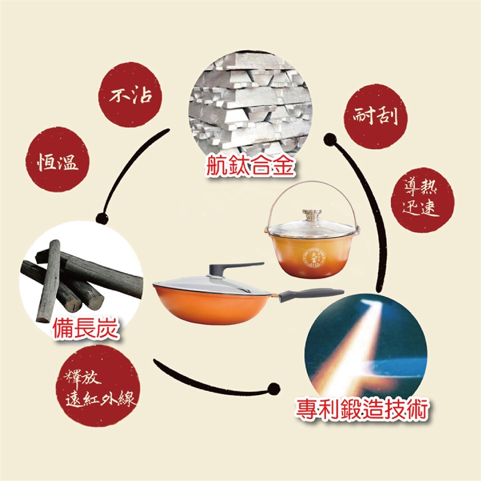 - 材質:備長炭遠紅外線元素多層複合金強化處理、航鈦合金、不鏽鋼強化玻璃鍋蓋