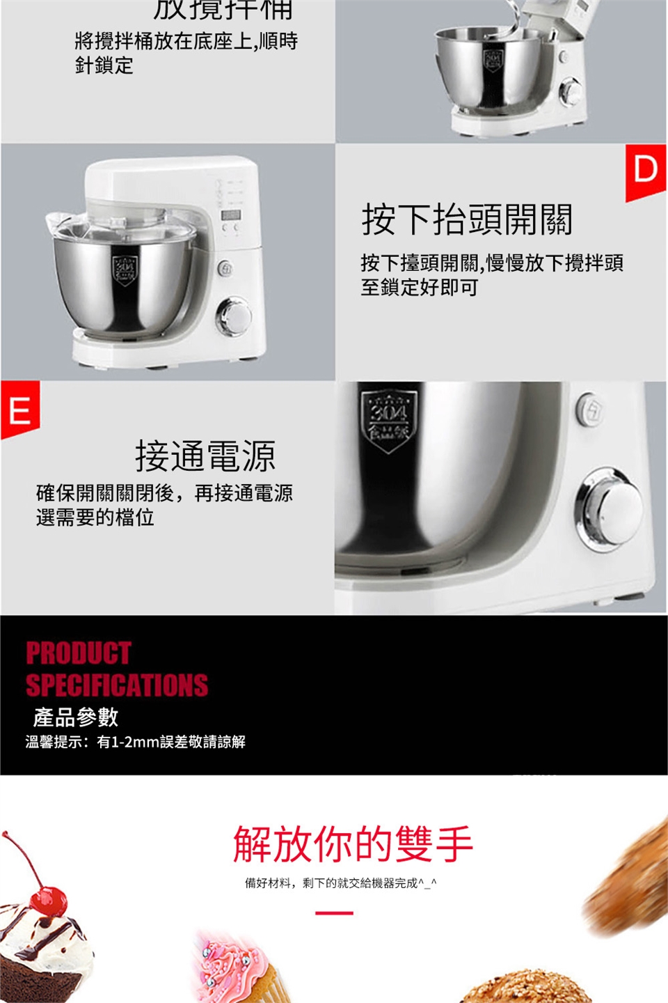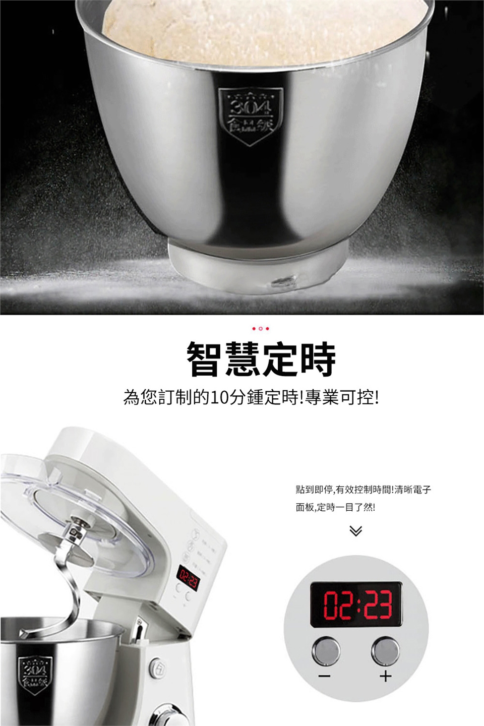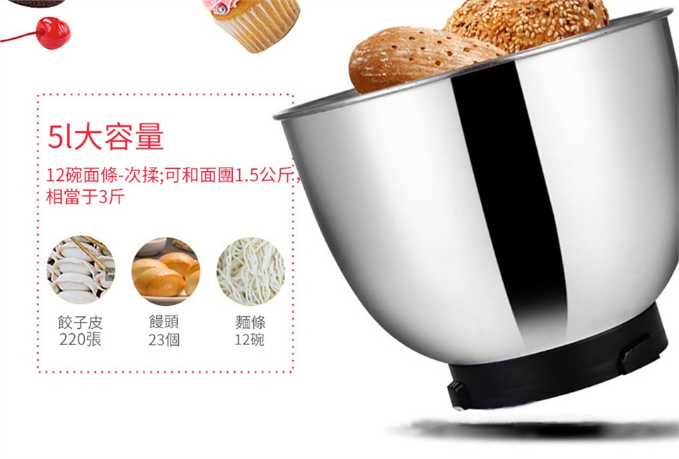2,産品標配爲鋁質攪面鈎,其最大的優點是攪面量大,起團快;但出膜的時間稍長一點,大約在15-25分鍾左右。攪面量1000克。