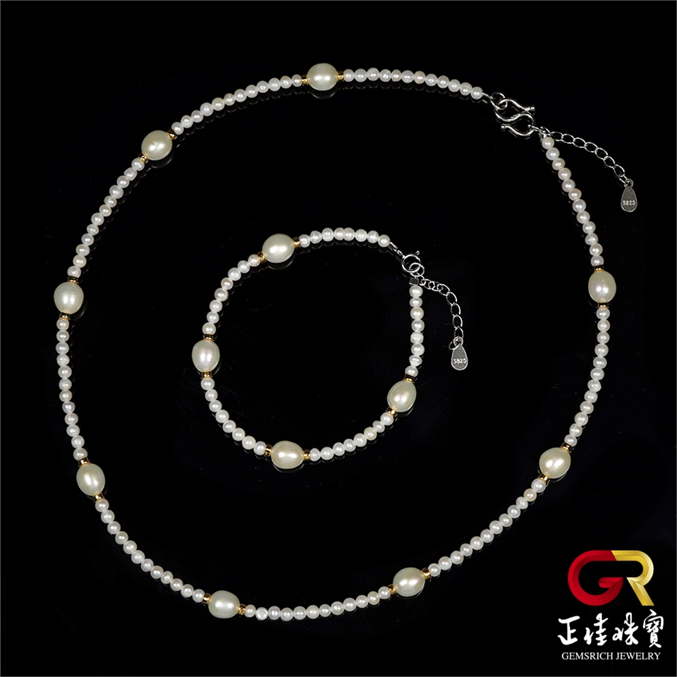 天然淡水珍珠 3mm 珍珠米珠 銀鑲珍珠吊墜 珍珠項鍊 珍珠手鍊 珍珠套組|925銀
