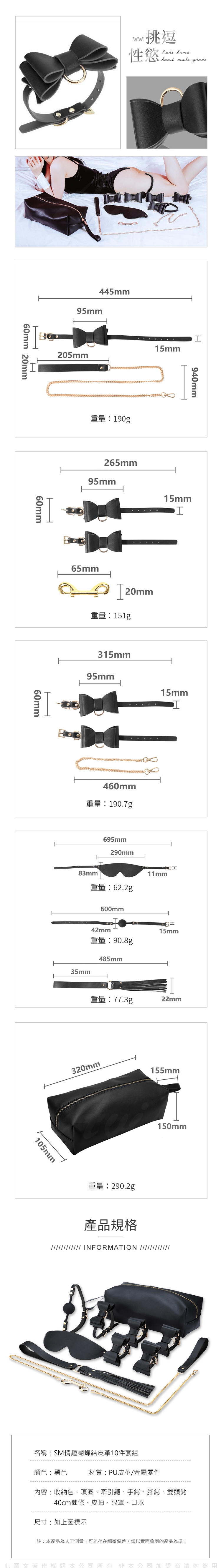 套組內容豐富,包括項圈、牽引繩、手銬、腳銬、雙頭銬、40cm鍊條、皮鞭、眼罩、口球等,每一件都是精心設計,為您帶來無比刺激的遊戲體驗。