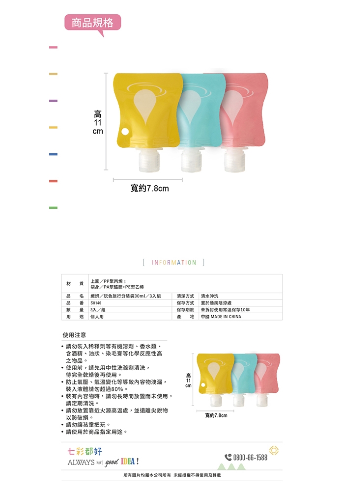 ◎ 注意事項:請勿裝入化學反應性高之物品