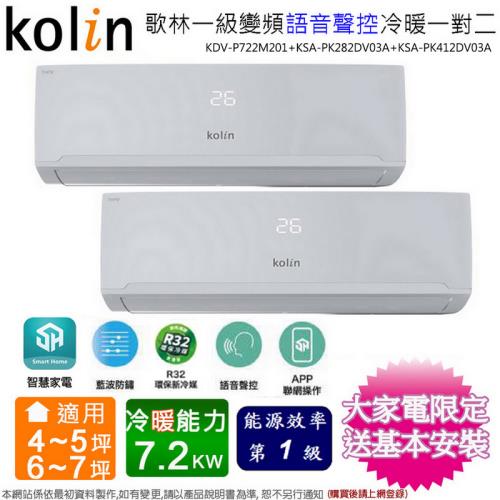 歌林4-5坪+6-7坪一級變頻冷暖一對二分離式冷氣KDV-P722M201(2.8kw+4.1kw)~含基本安裝