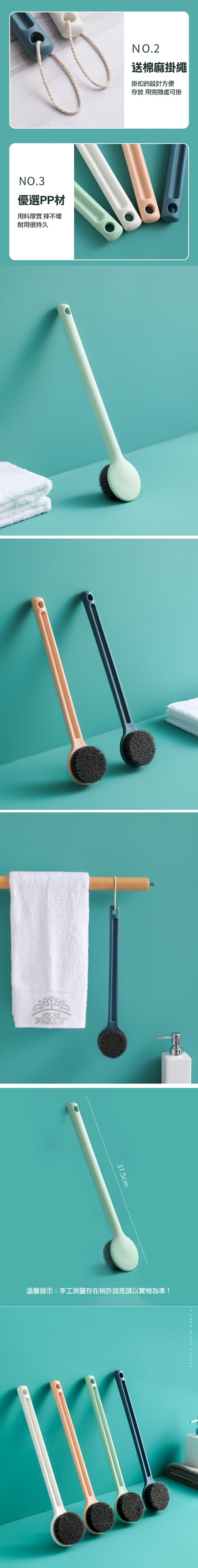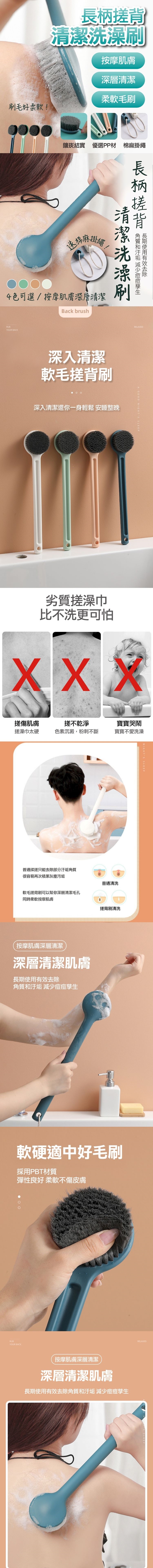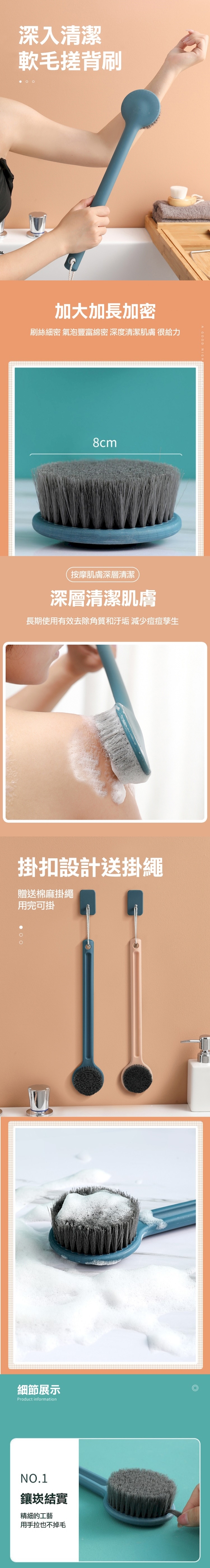忙錄一整天身體累積了汙垢,背部洗不到,造成肌膚毛孔堵塞,長柄洗澡刷,解決您的煩惱,濃密植毛料,柔軟不傷肌膚,深層潔淨,加長30公分手柄,背部輕鬆刷,大刷頭快速起泡,去除角質汙垢,棉麻掛繩,可掛設計,方便晾曬防霉