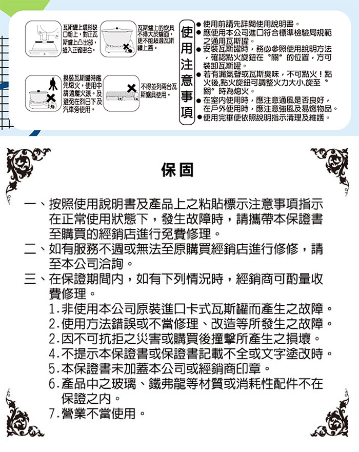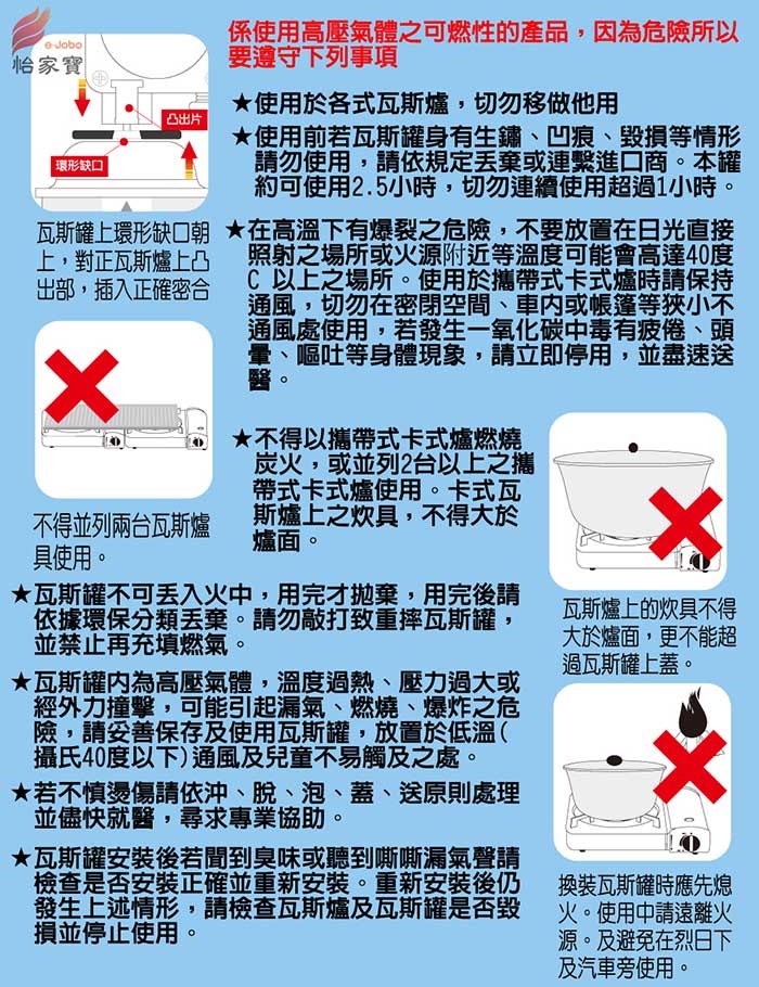 1.爐架上使用的鍋具不可大於爐架,以免瓦斯罐受熱影響內壓升高。