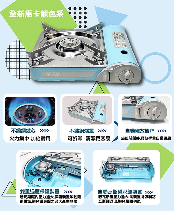 3.卡式爐安全裝置啟動致瓦斯罐跳脫時,是由於瓦斯罐內部壓力過大,切勿再壓回繼續使用。