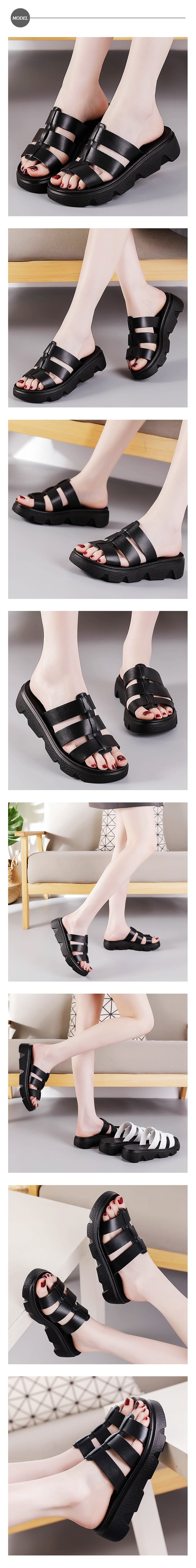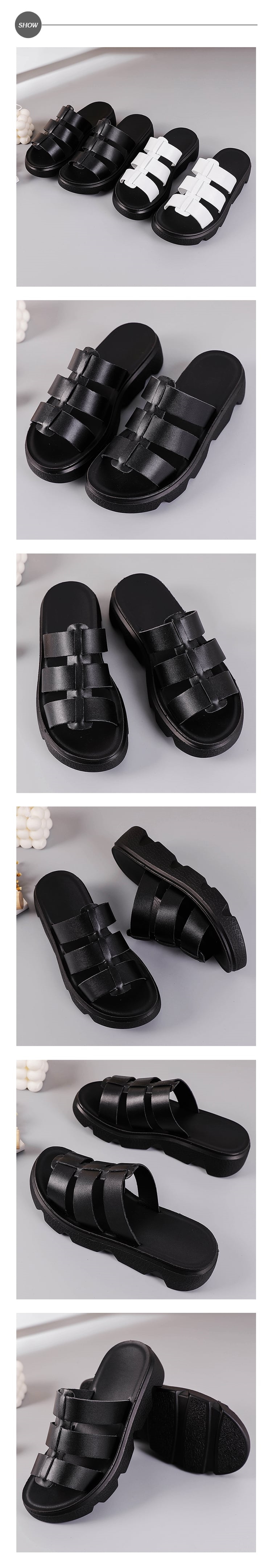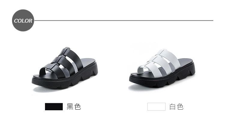 【MOM】真皮厚底羅馬拖鞋/真皮魚骨縷空復古厚底羅馬拖鞋 女鞋 黑