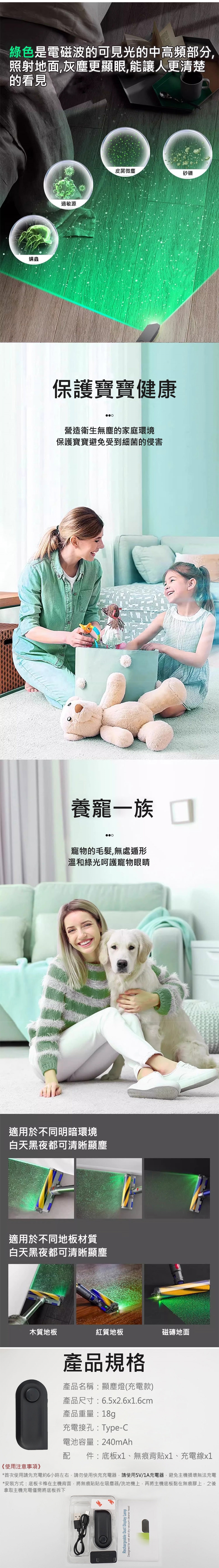 ◆採用綠光照射顯塵,讓灰塵/毛髮/碎屑...等無所遁形,打掃更乾淨