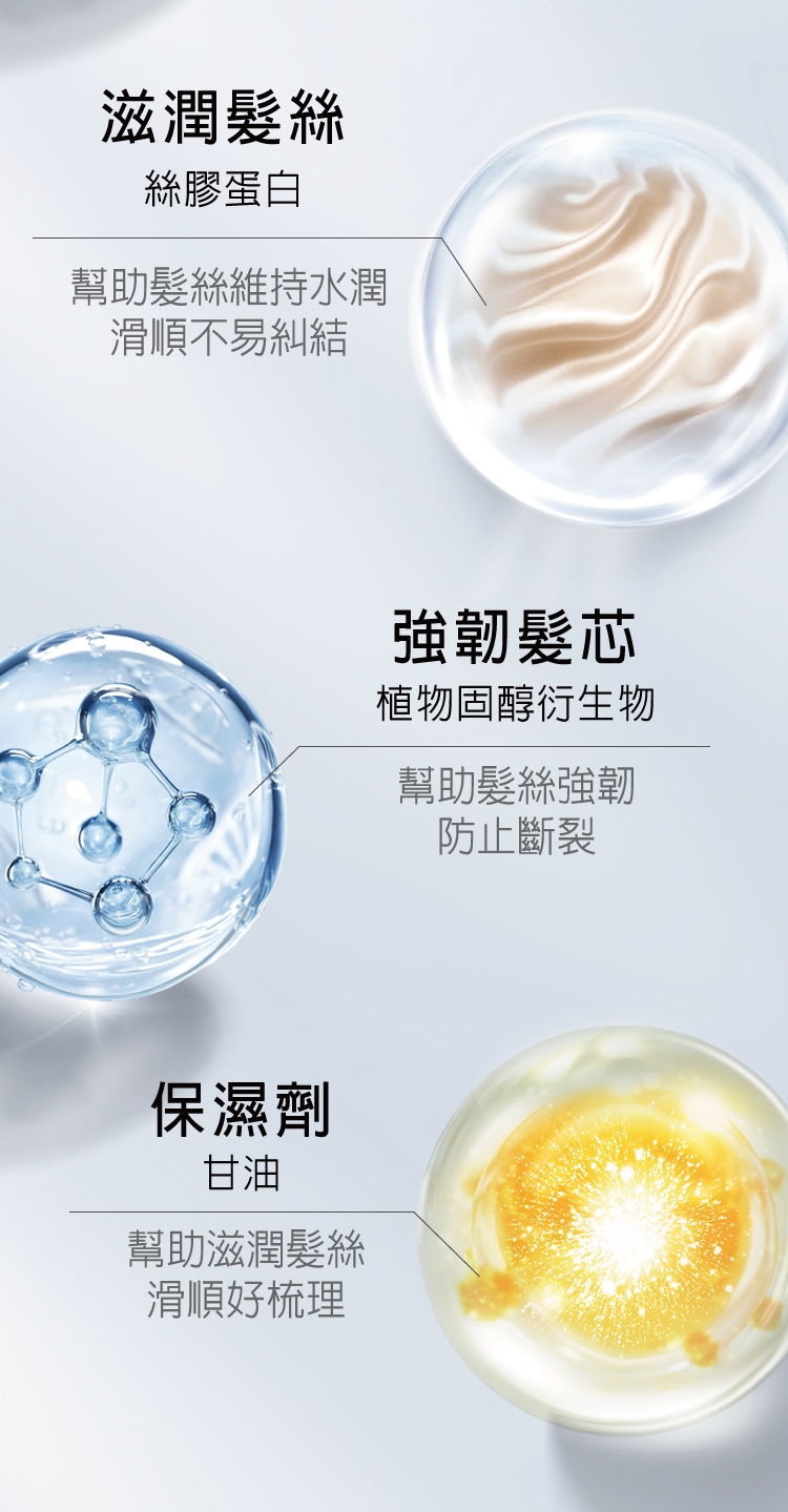 ・輕透質地能快速滲入髮絲,打造不黏膩的清爽柔順
