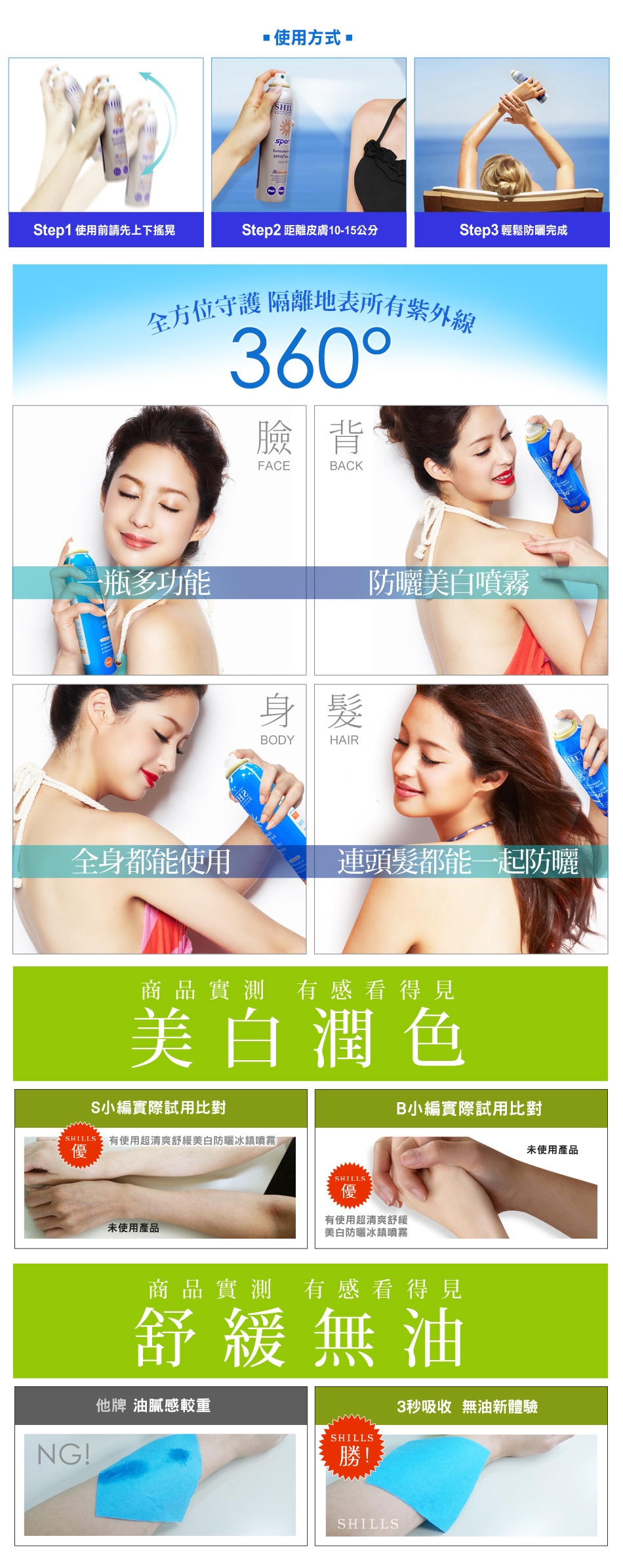 1. 使用前充分上下搖勻,於活動前均勻噴灑於臉部、背後、頭髮、四肢、胸前(臉部請先局部測試再使用)