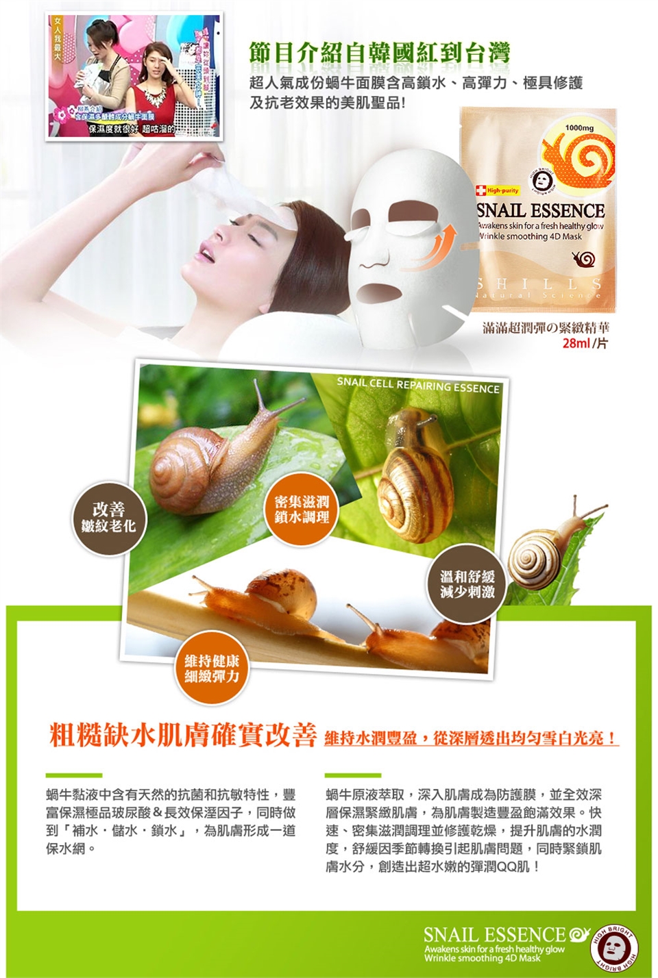 蝸牛原液彈力緊緻撫紋面膜:請於肌膚清潔後取出面膜服貼於臉部約10~15分鐘即可。