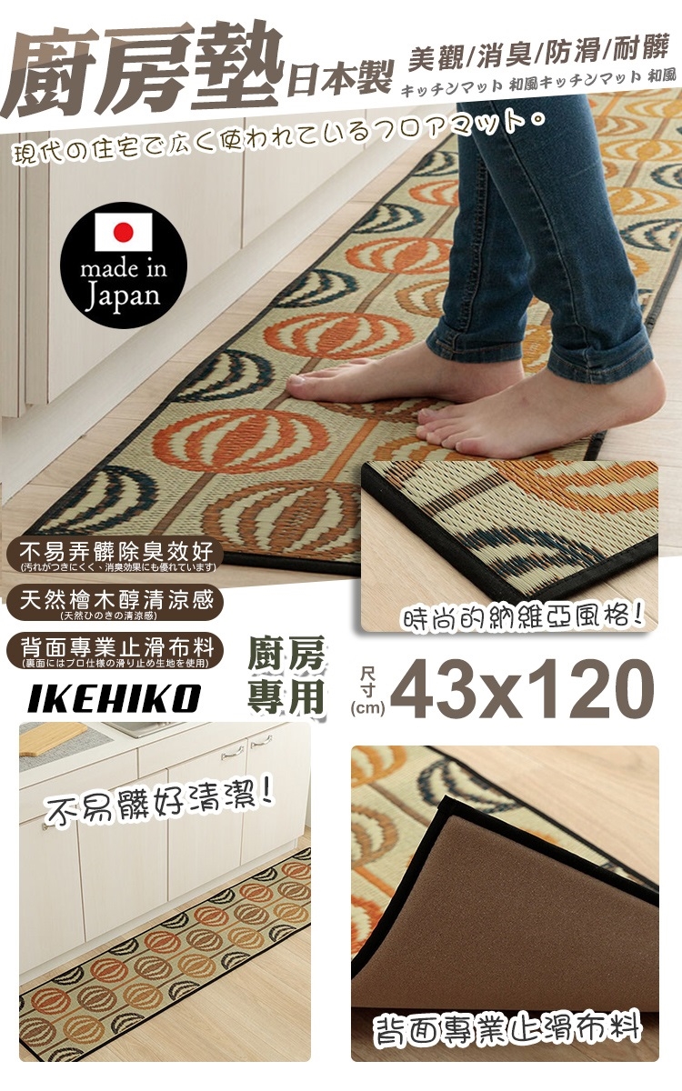 【IKEHIKO】日本製天然藺草納維亞廚房地墊43x120cm(天然墊 草墊 藺草墊 地墊 踏墊/11265237S1)