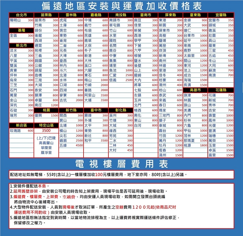 ●不含安裝商品僅運送到1樓,無法送上樓或送地下室。