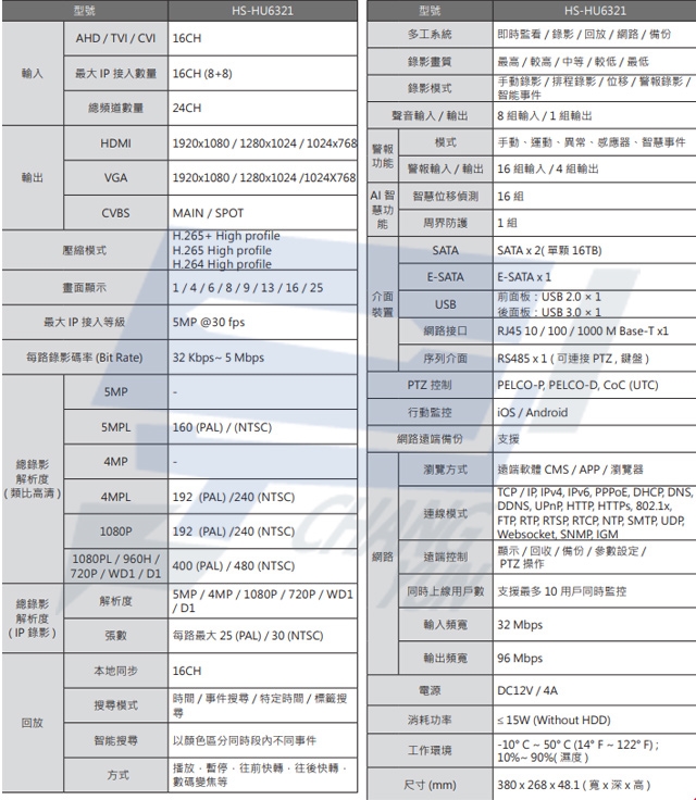 -支援 16CH ( 5MPL / 4MPL / 1080P / 1080PL / 960H / 720P / WD1 / D1 ) TVI/AHD/CVI 類比攝影機影像輸入