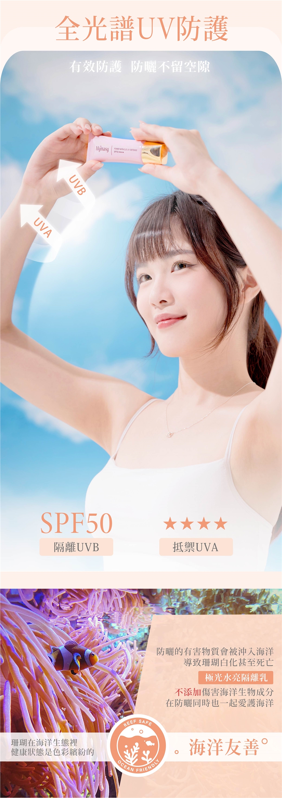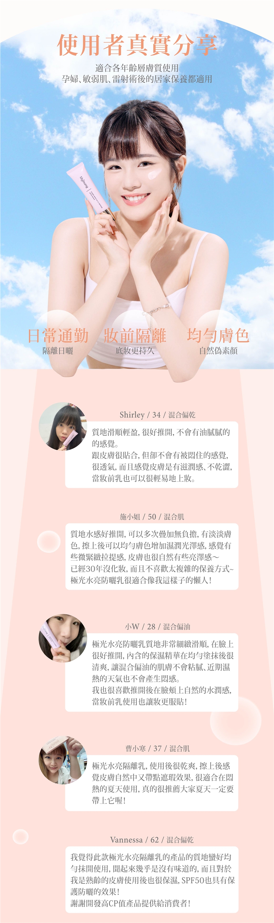 取隔離乳約10元硬幣大小,擦拭全臉及脖子;產品本身有潤色效果,可自動修飾毛孔,校正提亮膚色。泳池或海邊玩水須隨時補擦。