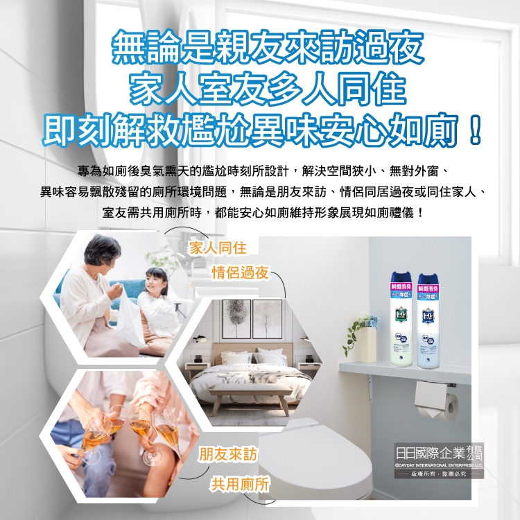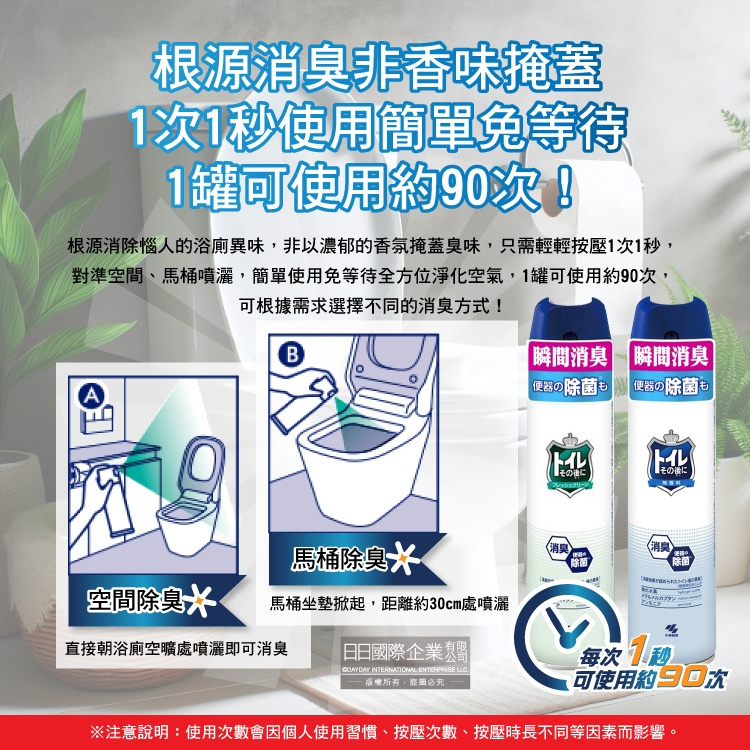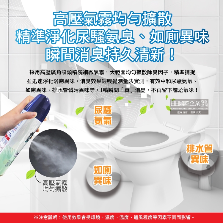 將馬桶坐墊掀起,距離馬桶30公分處按壓約1秒噴灑,或直接噴灑於浴廁空間即可。
