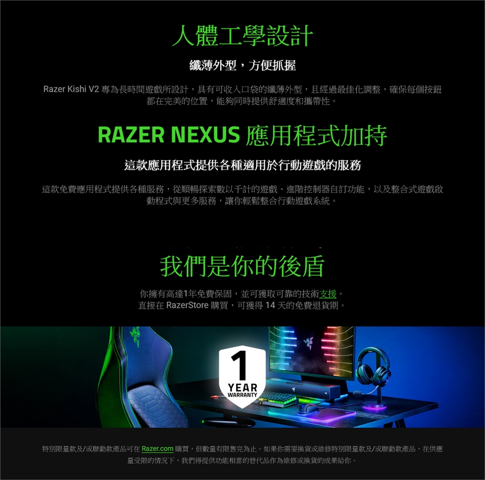 Razer Kishi V2 專為長時間遊戲所設計,具有可收入口袋的纖薄外型,且經過最佳化調整,確保每個按鈕都在完美的位置,能夠同時提供舒適度和攜帶性。