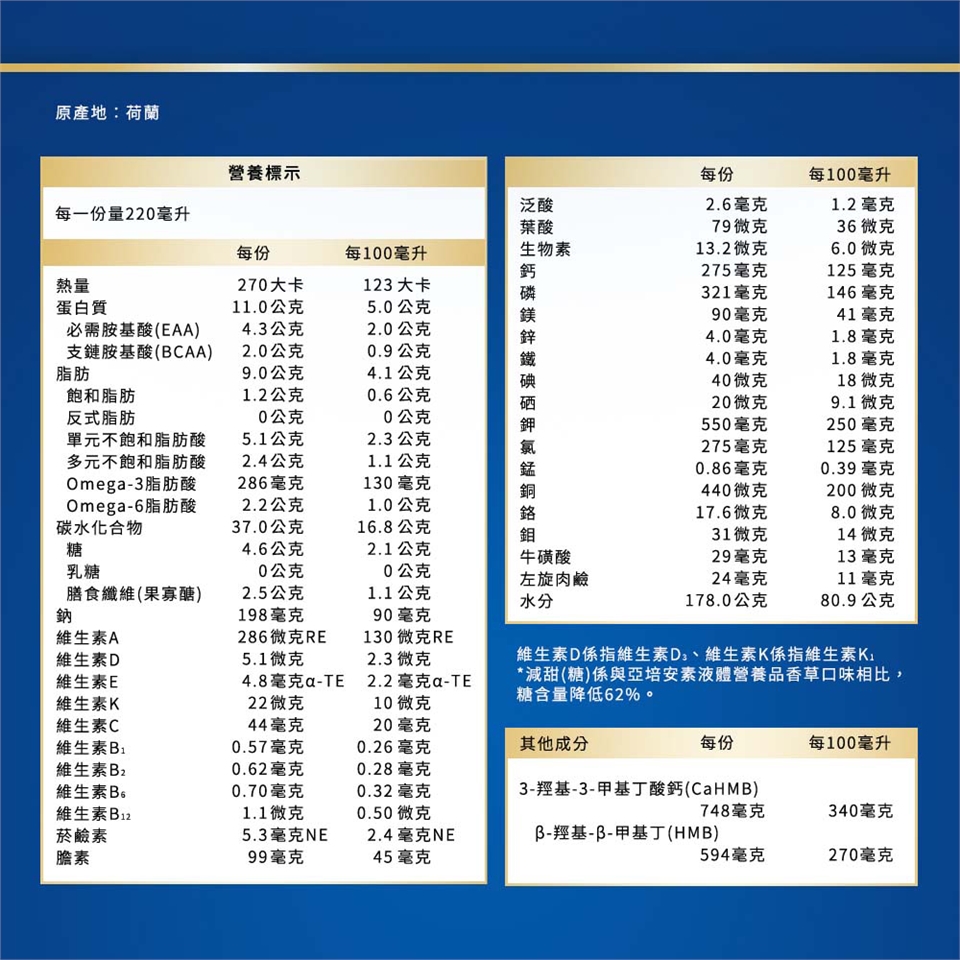 本品屬特定疾病配方食品,不適合一般人食用,須經醫師或營養師指導使用,作為唯一營養來源時,每日飲用1500大卡,可取代正餐,或作為二餐間使用之部分營養補充之口飲或管灌食品。非經專業人員指導,不建議給孩童,不適宜孕婦及未滿18歲者食用。半乳糖血症者不適用。請勿由靜脈注射。食用過量無助於疾病改善。本產品含有牛奶、大豆及其製品。本產品零乳糖。營養宣稱以100毫升為衡量基準。