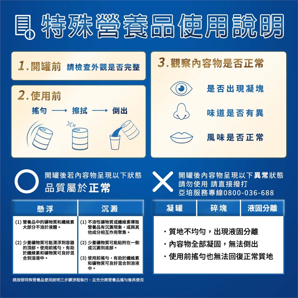 請在有效日期前使用,本產品有多種營養素,使用前請充分搖勻,以免沉澱。常溫及冰涼時皆可使用。